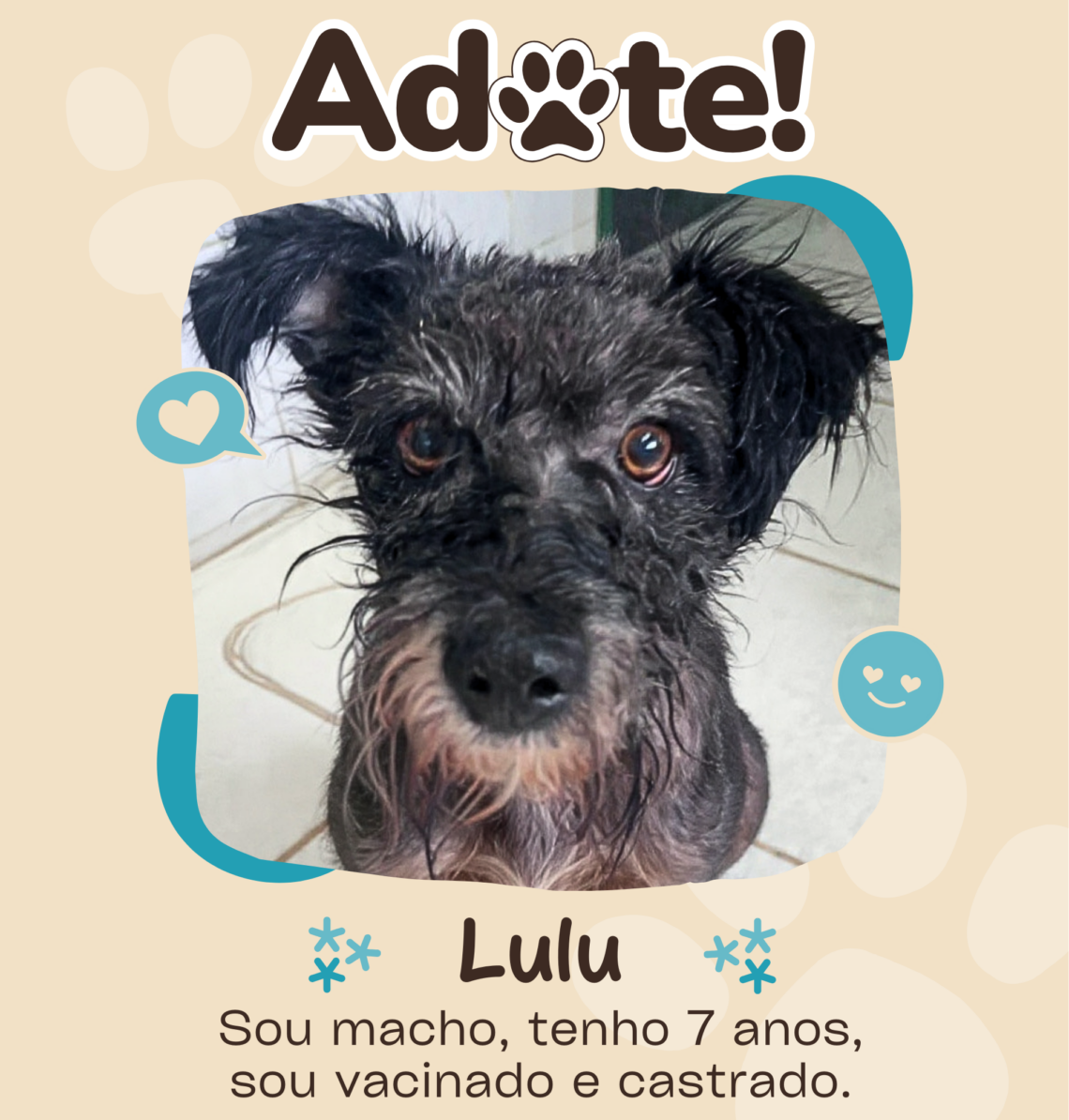 Adulto, Canino, Espécie, Macho, Para Adoção, Pelo longo, Porte médio 🐾 Lulu 🐾 Todos os animais da GCZ são castrados, vacinados e vermifugados. Muito Prazer, eu sou o Lulu! Venha até a Gerência de Controle de Zoonoses me conhecer! Nome Lulu Prontuário 504/24 Raça SRD Espécie Canina Sexo Macho Cor Preto acinzentado Pelagem Longa Porte Médio (16,2 kg) Idade Adulto Outras Informações Dócil, um pouco quieto, carinhoso, sociável. Mais fotos: Gostou de mim? Endereço Rua Igarapava, 239 – Bairro Valparaíso – Santo André, SP Horário Segunda—sexta: 8h–17h anterior 🐾 Antena 🐾 mais recente 🐾 Bilu 🐾 Você pode gostar 🐾 Mu 🐾 31 de agosto de 2019 🐾 Branquinho 🐾 17 de fevereiro de 2025 🐾 Antena 🐾 25 de novembro de 2025