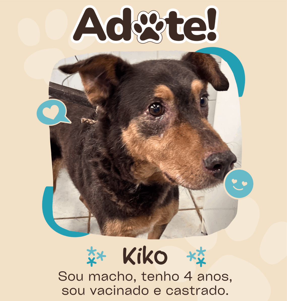 Canino, Macho, Para Adoção, Sem categoria 🐾 Kiko 🐾 Todos os animais da GCZ são castrados, vacinados e vermifugados. Muito Prazer, eu sou o Kiko! Venha até a Gerência de Controle de Zoonoses me conhecer! Nome Kiko Prontuário 477/22 Raça SRD Espécie Canina Sexo Macho Cor Marrom e branco Pelagem Longa Porte Médio (19 kg) Idade Adulto Outras informações Arisco. Mais fotos: anterior 🐾 Golias 🐾 Você pode gostar 🐾 Marrone 🐾 19 de fevereiro de 2025 🐾 Antena 🐾 25 de novembro de 2025 🐾 Miliante 🐾 17 de fevereiro de 2025