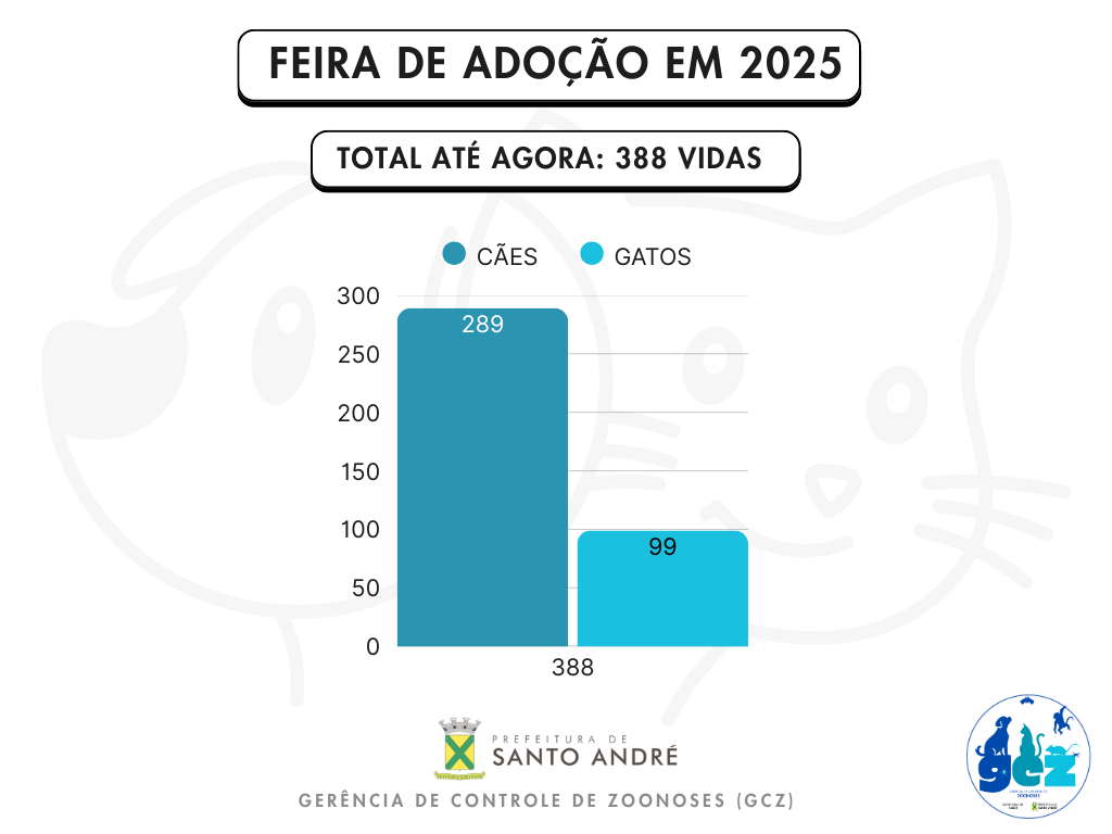 - Até o momento em 2025 nos meses de janeiro a dezembro foram adotados 388 animais. Sendo 289 cães e 99 gatos.