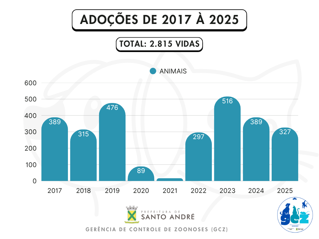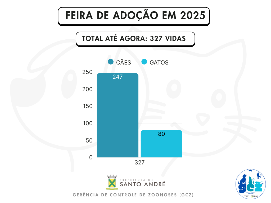 ADOÇÃO EM NÚMEROS Até o momento em 2025 nos meses de janeiro a setembro foram adotados 327 animais. Sendo 247 cães e 80 gatos. Neste importante trabalho, sabe-se que de 2017 até o momento foram adotados 2.815 animais, ganhando um lar para viver: