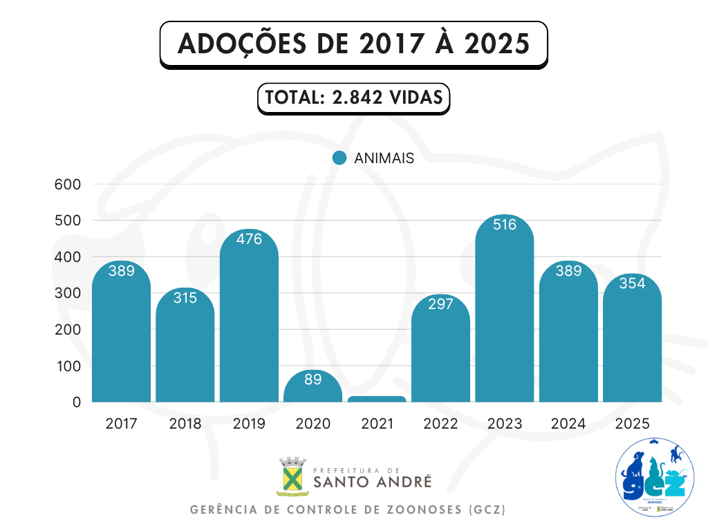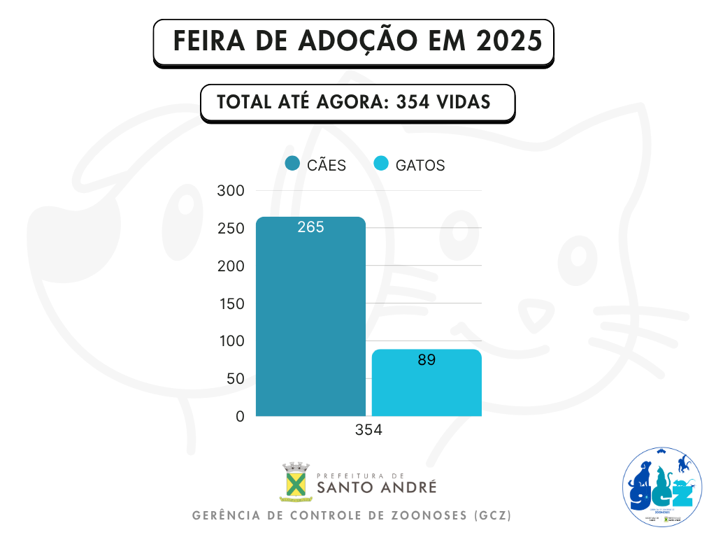 ADOÇÃO EM NÚMEROS Até o momento em 2025 nos meses de janeiro a outubro foram adotados 354 animais. Sendo 265 cães e 89 gatos. Neste importante trabalho, sabe-se que de 2017 até o momento foram adotados 2.842 animais, ganhando um lar para viver: