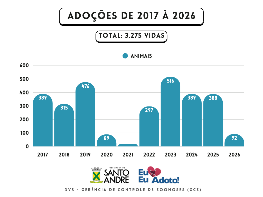 - Neste importante trabalho, sabe-se que de 2017 até o momento foram adotados 3.275 animais, ganhando um lar para viver: