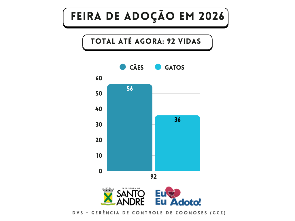 - Até o momento em 2026 foram adotados 92 animais. Sendo 56 cães e 36 gatos.